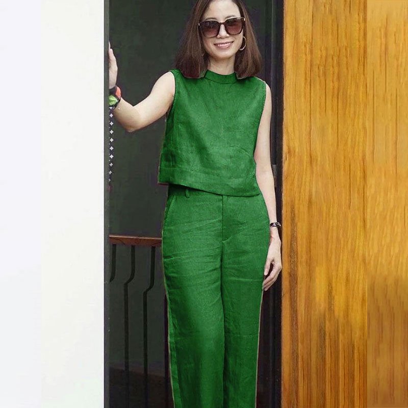 純色無袖休閒棉麻套裝女